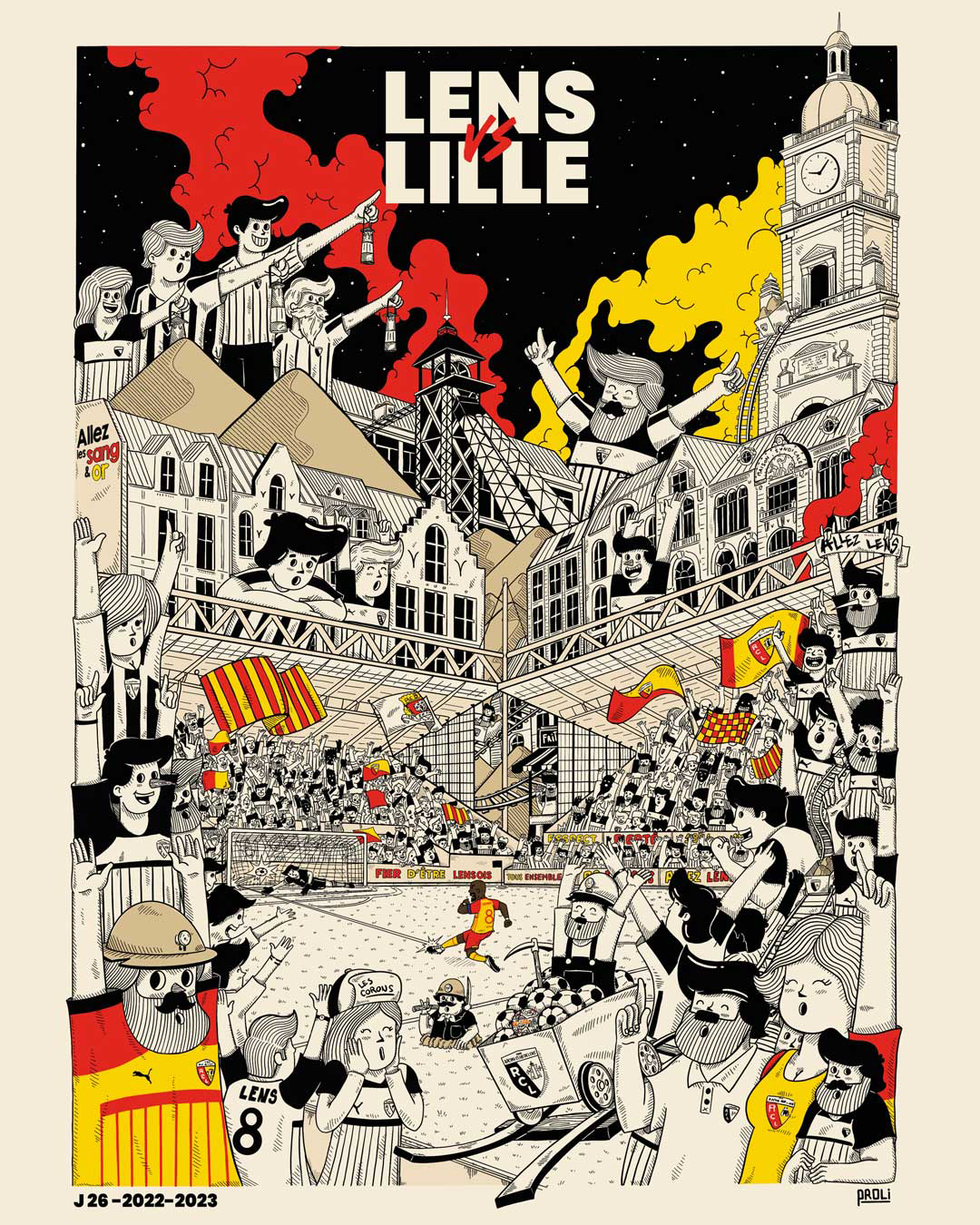 Cette affiche en méritait bien une ! À l’occasion du 107e derby du Nord ce samedi, une affiche collector réalisée par l’artiste peintre Proli, en partenariat avec Maison Transversale, sera mise en vente en boutique le jour de la rencontre. Porteurs de valeurs fortes et symboles d’unité, les présents ont été imprimés en France sur papier mat (30x40cm ; 250g/m²), intégrant la problématique du développement durable chère au Racing. En mêlant l’histoire de toute une région et les couleurs sang et or, cette affiche marque la ferveur et les valeurs fortes qui unissent le peuple artésien.