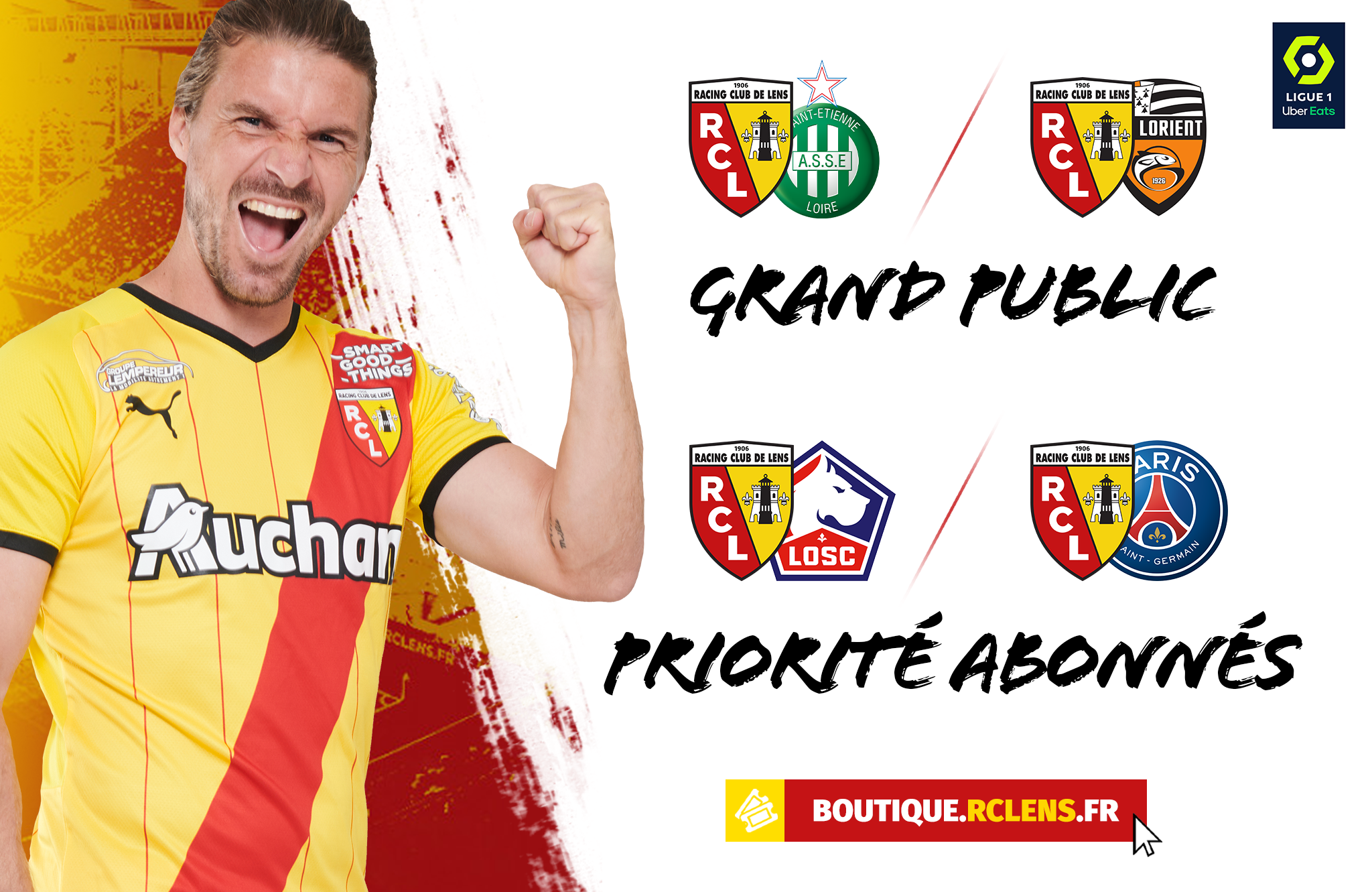 - À partir du mardi 10 août - 12h : sur boutique.rclens.fr et aux guichets de la billetterie