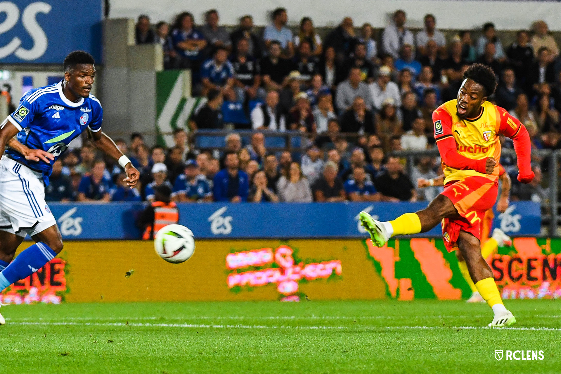 Dès les premières minutes de jeu, les Artésiens mettent du rythme mais font face à un bloc strasbourgeois compact qui œuvre en phase de transition. Parfaitement entré dans sa partie à l’image de ses coéquipiers, le capitaine Brice Samba est impérial et repousse la première tentative de Dilane Bakwa, aux vingt mètres. Au fil des minutes, les Lensois mettent leur jeu en place et se voient récompensés sur leur première offensive collective. Après un superbe une-deux entre Florian Sotoca et Elye Wahi, le numéro 9 artésien décoche une frappe puissante du pied gauche, à destination du petit filet droit, et inscrit son premier but en Sang et Or (0-1, 16’) !