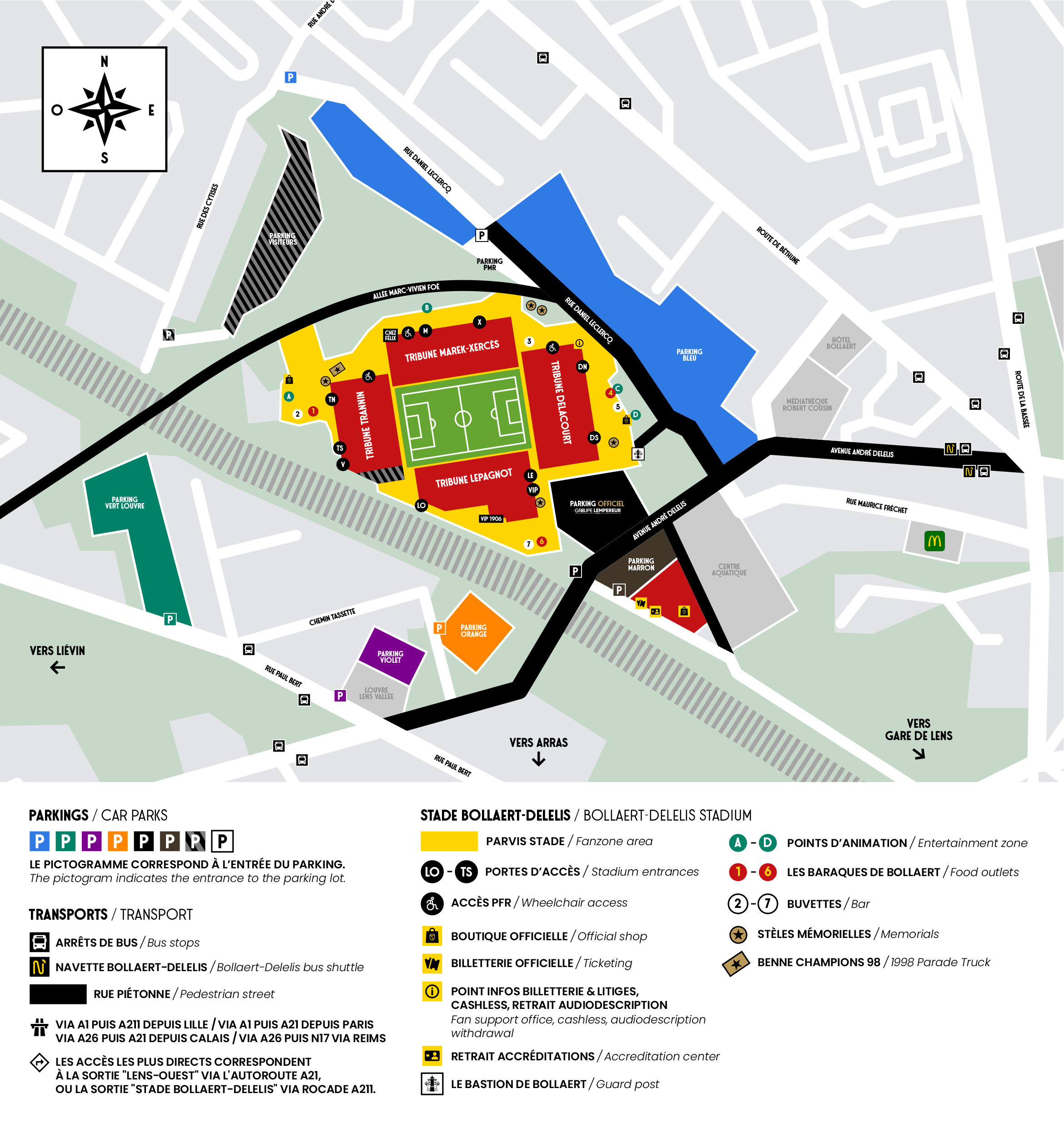 Le dispositif permet aux détenteurs d’un billet pour Bollaert-Delelis (via un QR code) de garer leur véhicule à l’Arena Stade Couvert de Liévin ou au parking CRVO de Lens, adaptés pour les flux importants et totalement sécurisés. Une navette – dont la première part 2h avant le coup d’envoi – dessert ensuite l’enceinte artésienne toutes les 10 minutes via un itinéraire direct. Le temps de trajet est garanti grâce à la voie bus existante sur l’itinéraire de la Bulle 1 TADAO. Le dernier départ se fait 20 minutes avant le coup d’envoi pour être certain d’arriver à l’heure en tribune.