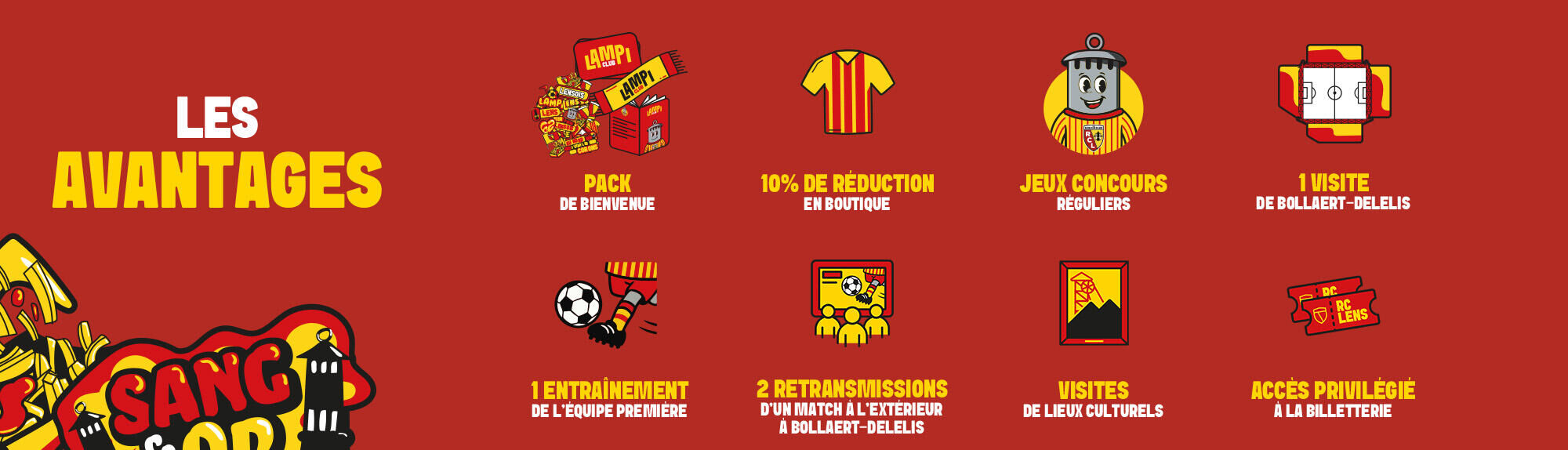 Le Lampi Club accompagne les jeunes supporters lensois dans leur découverte de l’histoire du Racing, de ses valeurs et du patrimoine local. À travers ses avantages exclusifs, ce programme jeunesse remplit une mission de transmission, une valeur forte du club. En finalisant leur inscription, les membres valident également la commande d’un kit aux couleurs sang et or : carte membre, écharpe de supporter, stickers, sac et livret pédagogique sur le RC Lens.